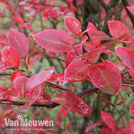 This excellent mid season variety, produces rich flavoured fruit in abundance in August. Fully hardy, this compact shrub provides interest all year round with elegant white flowers in spring, and colourful crimson foliage set against red stems in the winter. Blueberry ‘Bluecrop’ is perfect for a smaller garden or a large pot on the patio. Height: 120cm (4’). Spread: 90cm (3’).
