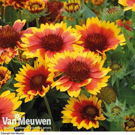 Gaillardia aristata ‘Arizona Sun’ certainly lives up to its name by producing a continuous display of sizeable flower heads in blazing shades of red, orange and yellow. This hardy perennial requires little maintenance and performs well even on poor, dry soils. The spectacular daisy flowers thrive regardless of the weather, persevering well into autumn, and are simply stunning when used as cut flowers for an indoor display. This Blanket Flower is ideal for filling gaps at the front of sunny borders and in containers. Height: 30cm (12″). Spread: 45cm (18″).